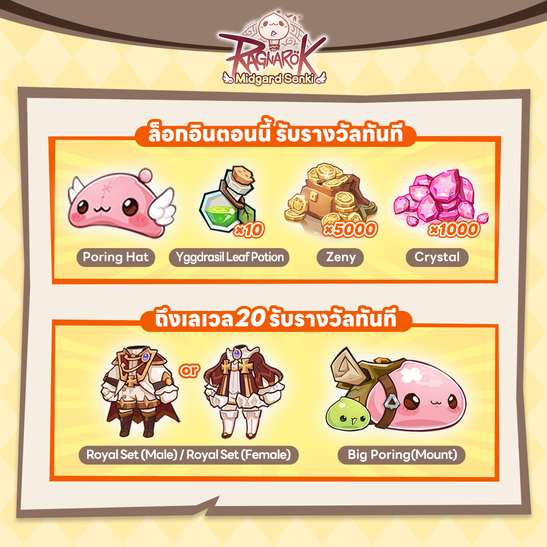 พิเศษสุด! เมื่ออัปเลเวลตัวละครถึงเลเวล 20 รับโบนัสแพ็กเกจของขวัญสุดเอ็กซ์คลูซีฟเพิ่มทันที ภายในแพ็กเกจประกอบไปด้วย: ชุดเซ็ต Royal และ สัตว์ขี่ Big Poring ที่จะมาเป็นคู่หูสุดแกร่งในการผจญภัยของคุณ!