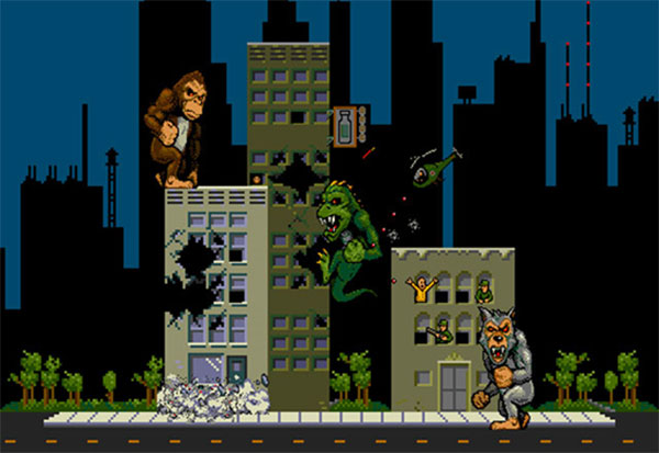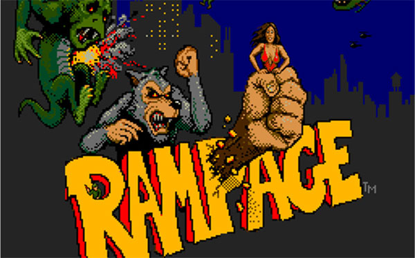 Rampage วีดีโอเกมที่ถูกสร้างขึ้นในปี ค.ศ 1986 โดยนักพัฒนาเกม Brian Colin และ Jeff Nauman โดยผู้เล่นจะรับบทคนธรรมดาก่อนที่จะกลายร่างเป็นสัตว์ประหลาดยักษ์ 3 ตัว ได้แก่ George ลิงยักษ์, Lizzie กิ้งก่ายักษ์ และ Ralph หมาป่ายักษ์
