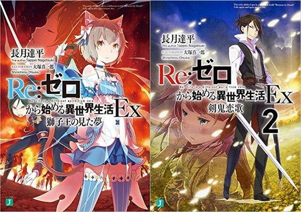 ภาพปกนิยาย “Re : Zero Kara Hajimeru Isekai Seikatsu EX” (Re:ゼロから始める異世界生活Ex)  ภาคพิเศษที่เป็นเนื้อหาร่วมแบบ Side Stories อีก 2 เล่มด้วยกัน ออกวางจำหน่ายเมื่อวันที่ 25 มิถุนายน ปี 2015