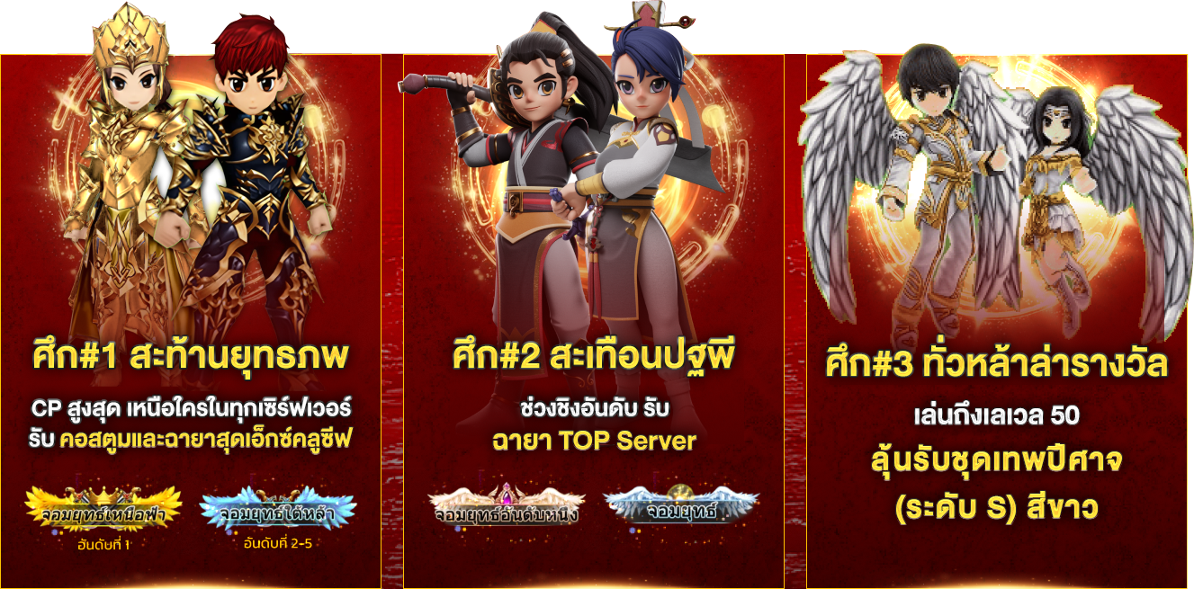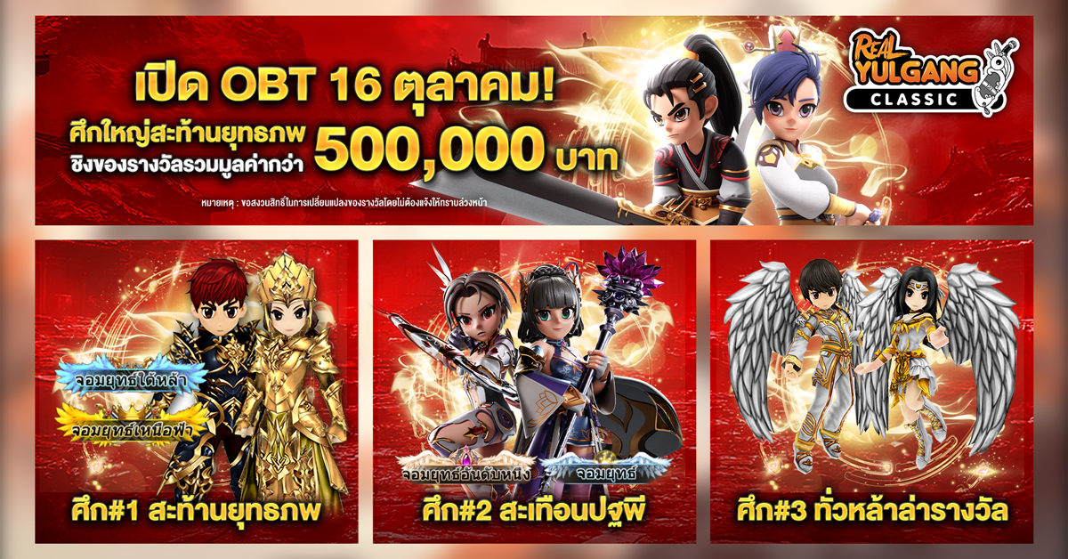 ร่วมชิงความเป็นหนึ่งกับ “ศึกใหญ่สะท้านยุทธภพ” กิจกรรมจัดอันดับท้าทายฝีมือเหล่าจอมยุทธ์ ชิงรางวัลรวมมูลค่ากว่า 500,000 บาท! ติดตามรายละเอียดเพิ่มเติมได้ที่ https://realygclassic.playpark.com/