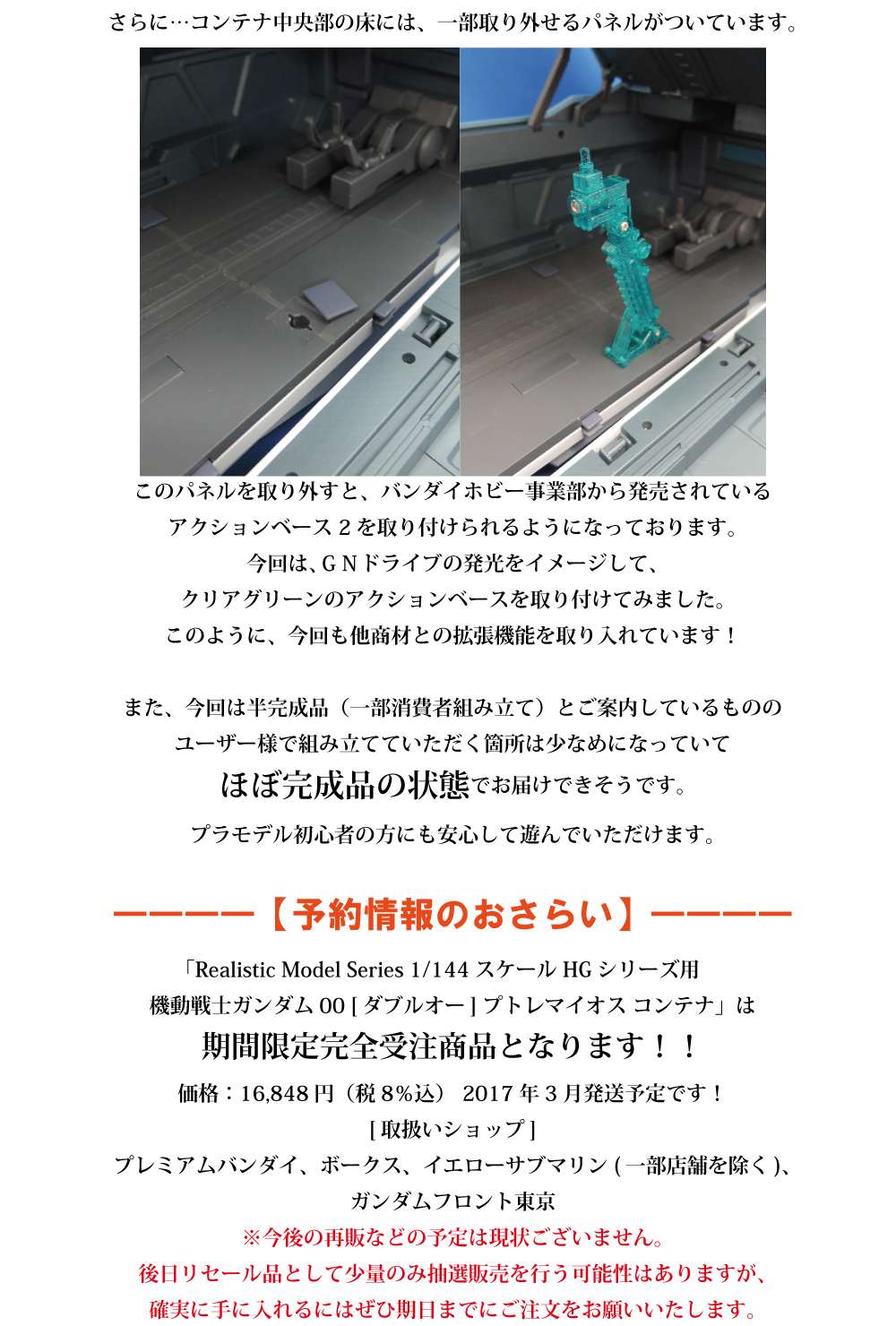 และความสามรถของยานคอนเทนเนอร์นี้ยังมีอีกหลายอย่างเช่น สามารถพลางตัวเพื่อเข้าใกล้เป้าหายก่อนส่งหุ่น Ms เข้าไปจักการกับภาระกิจต่างๆให้สำเร็จ ทั้งนี้ความสามารภทั้งหมดและการขับเครื่องยานขนาดใหญ่นี้ก็มาจาก ‘เตาพลังงานแสงอาทิตย์’ที่ถูกคิดค้นขึ้นเมื่อราว 200 ปีก่อนก่อตั้ง องกรณ์เซเลสเซียล บีอิ้ง