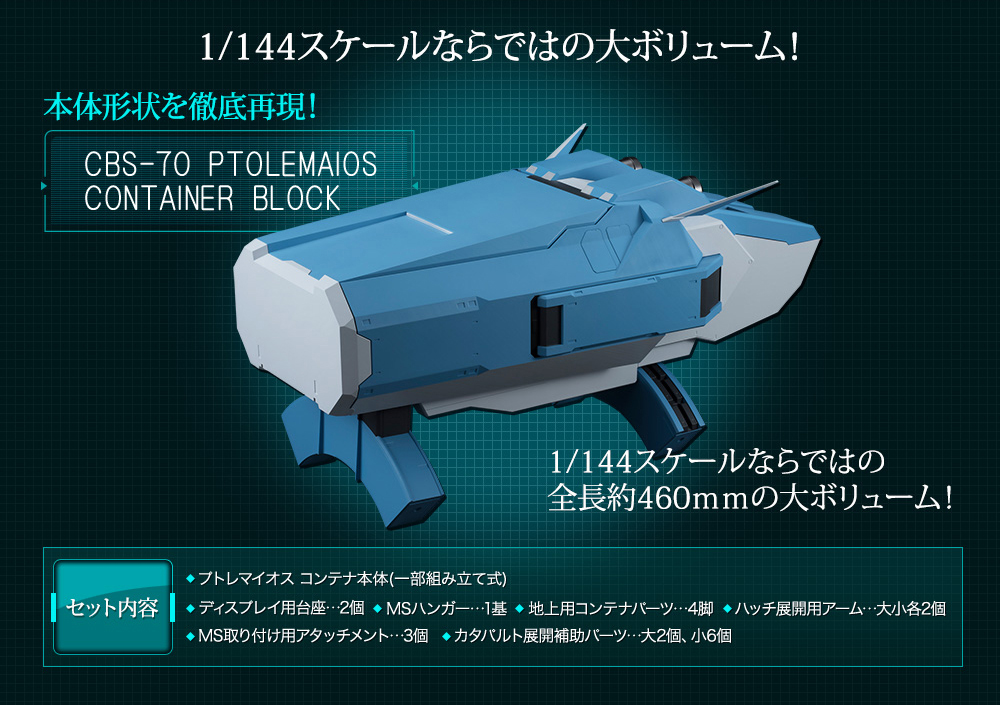 โปโตเลมีคอนเทนเนอร์ขนส่งที่ถูกสร้างขึ้นเพื่อเป็นยานประจำการพร้อมขนส่งโมบิลสูททั้งยังถูกสร้างขึ้นมาเพื่อใช้ในรุ่นที่ 3 ของเซเลสเซียล บีอิ้งและเพื่อการติดตามข้อมูลและภาระกิจต่างๆขององกรณ์โดยมีรหัสเครื่องว่า CBS-70 Ptolemaios
