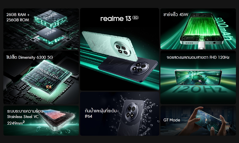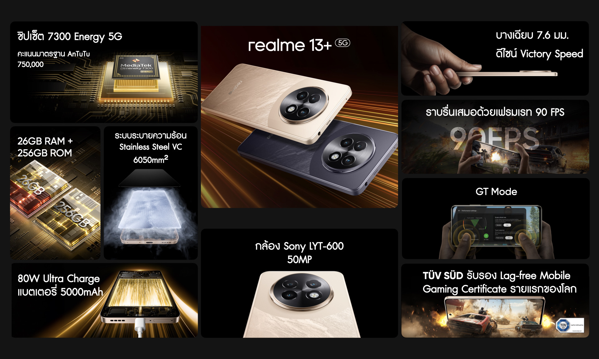 เกมมิ่งสมาร์ตโฟนตัวแรงแห่งปี! วันนี้ realme (เรียลมี) แบรนด์สมาร์ตโฟนเพื่อคนรุ่นใหม่ที่เติบโตเร็วที่สุดในโลก เปิดตัว “realme 13 Series 5G” สมาร์ตโฟนรุ่นล่าสุดจากตระกูล Number Series ในประเทศไทยอย่างเป็นทางการ พร้อมขึ้นแท่น “ผู้นำด้านเกมมิ่งสมาร์ตโฟน (Gaming Dominator)” ด้วยการอัปเกรดประสิทธิภาพขั้นสุดระดับ “อัลตร้า” ทั้ง 3 ด้าน ได้แก่ ULTRA POWER ด้วยซีพียูตัวท็อปของเซกเมนต์ – ULTRA FAST ระบบชาร์จเร็วทันใจ – ULTRA COOL ระบบระบายความร้อนใหม่ล่าสุด เมื่อผสานการทำงานจะมอบประสบการณ์สมาร์ตโฟนอันยอดเยี่ยม ทั้งการใช้งานแนวไลฟ์สไตล์ในชีวิตประจำวันและการเล่นเกมออนไลน์อันหนักหน่วง ด้วยประสิทธิภาพการทำงานที่เร็วแรง ลื่นไหลขั้นสุด และปราศจากปัญหาความร้อนกวนใจ การันตีด้วยสโลแกน Speed to Victory ที่พร้อมให้คุณเป็นผู้ชนะในทุกเกมการแข่งขันโดย “realme 13 Series 5G” นำเสนอ 2 รุ่น ทั้ง “realme 13+ 5G” และ “realme 13 5G”
