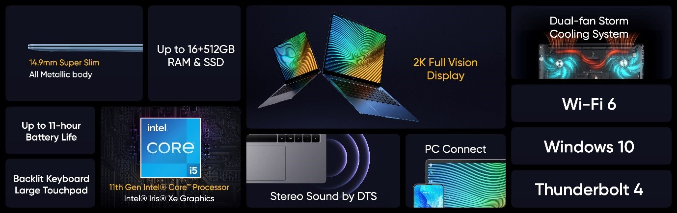 realme Book ขับเคลื่อนด้วยโปรเซสเซอร์ Intel® Core เจนเนอเรชั่น 11 และระบบระบายความร้อนแบบคู่ ช่วยให้มั่นใจได้ว่า สามารถเล่นเกมหรือทำงานได้อย่างมีประสิทธิภาพไม่สะดุด นอกจากนี้ ยังมี Dual-channel LPDDR4x RAM สูงสุด 16GB และเก็บข้อมูล PCIe® SSD ได้สูงสุด 512GB รองรับเทคโนโลยี Super-Fast Charge 65W สามารถใช้งานยาวนานได้สูงสุด 11 ชั่วโมง