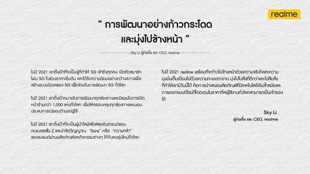 แบรนด์สมาร์ทโฟนหลักของโลก โดยครองอันดับ 7 จากตลาดสมาร์ทโฟนทั่วโลก คุณ Sky Li ผู้ก่อตั้งและซีอีโอของ realme ได้เขียนจดหมายเปิดผนึกเพื่อกำหนดแผนการและแนวทางในการพัฒนาธุรกิจในอนาคตต่อยอดความสำเร็จจากปี 2020 ที่ผ่านมา