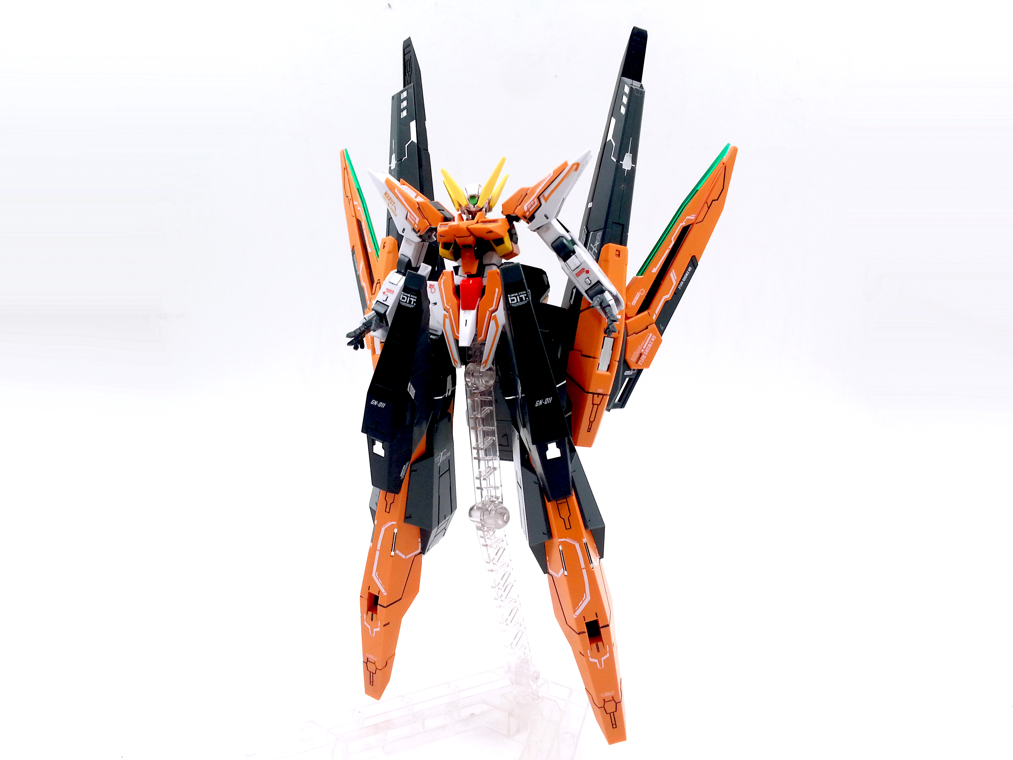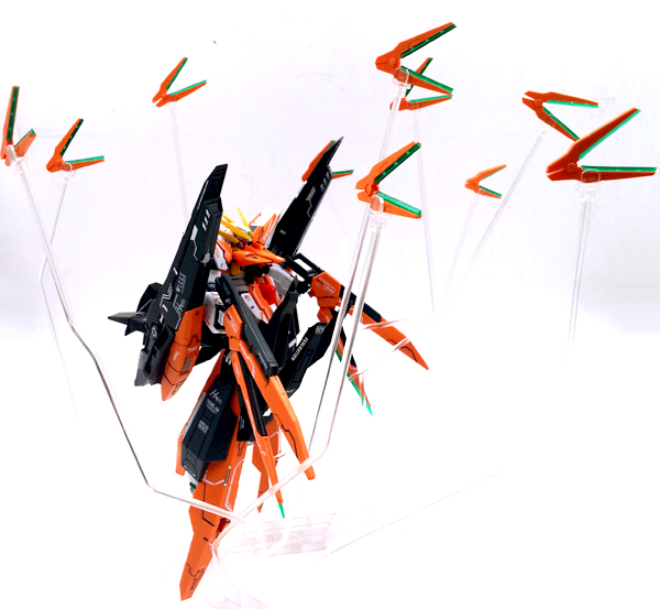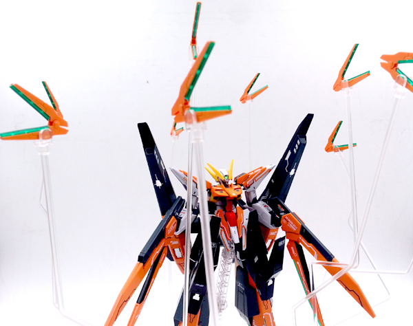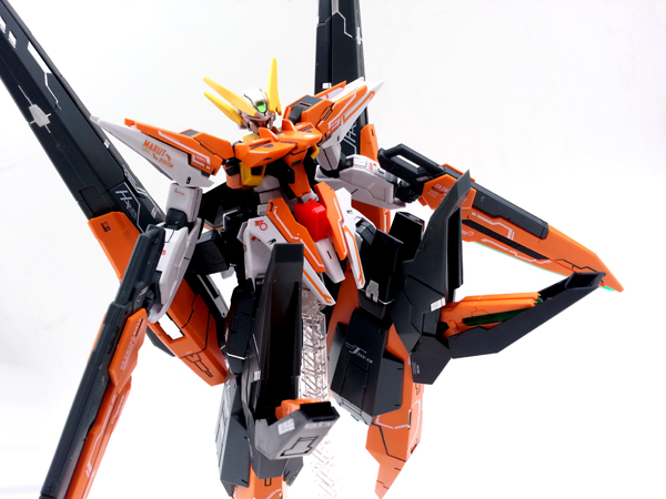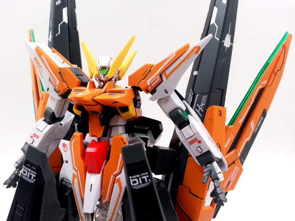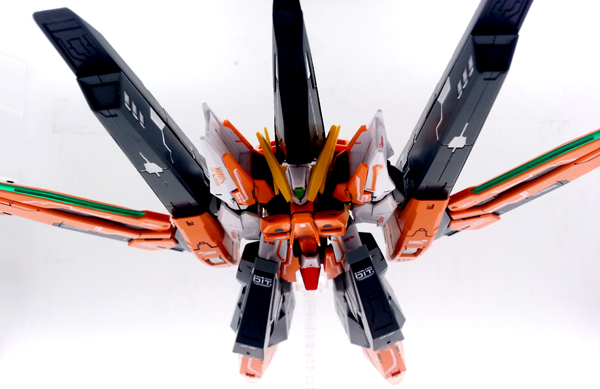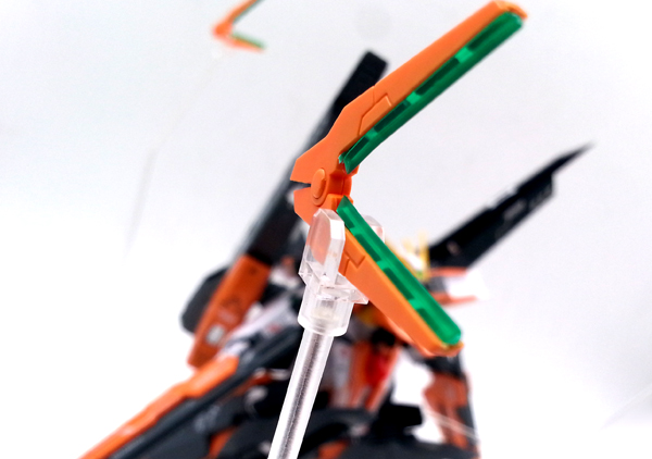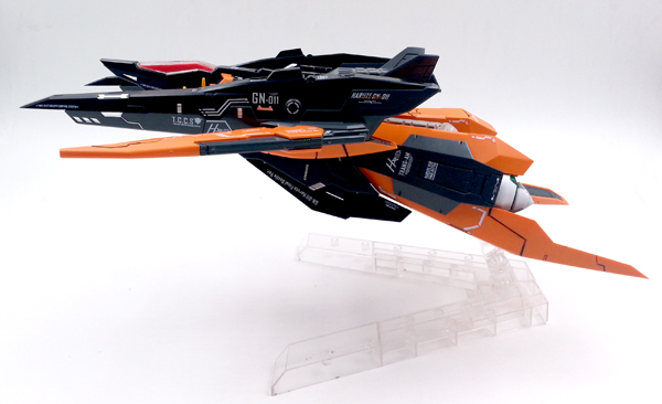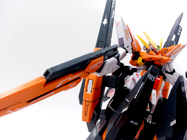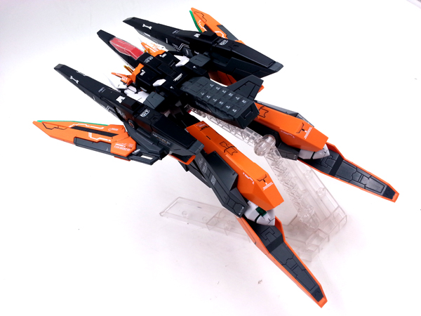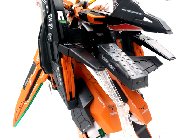 แผงหลังในส่วนของยานบิน จะแยกชิ้นส่วนสีแดงที่เป็นกระจกห้องนักบินอย่างชัดเจน ต่างกับงานบันไดที่ใช้สติ๊กเกอร์สีแดงหุ้ม และในส่วนของชุดบูสเตอร์ ก็สามารถกางออกได้ เพื่อเก็บ GN Scissor