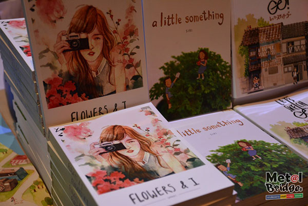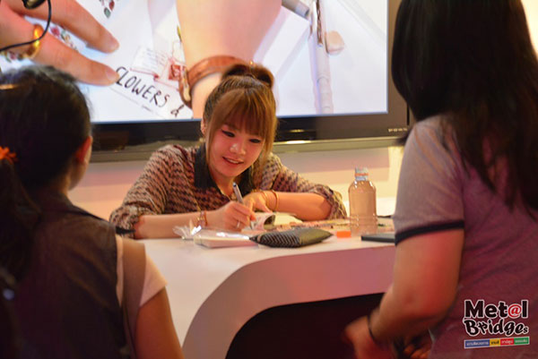 การแสดงผลงานศิลปะโดยศิลปินก็มีให้เราได้ชมกัน หรือแม้แต่แจกลายเซ็นหรือให้ศิลปินวาดภาพให้กันแบบสดๆ ก็มีนะเออ~ เช่น “เลขา” ศิลปินนักวาดภาพประกอบคนนี้ที่กำลังวาดภาพแจกให้สำหรับผู้สนใจที่เข้าร่วมกินกรรมจากทางบูท OOKBEE COMICS