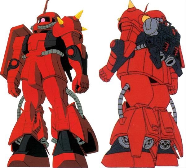 ซาคุสีแดง ตัวนี้เป็นของ จอห์นนี่ ไรเดน นักบินในสังกัดของ คิซิเรีย ซาบี้ ผู้มีฝีมือการขับโมบิลสูทที่เก่งกาจจนได้รับฉายาว่า สายฟ้าสีแดง และถูกเปรียบเป็นคู่แข่งของ ชาร์ อัสนาเบิ้ล