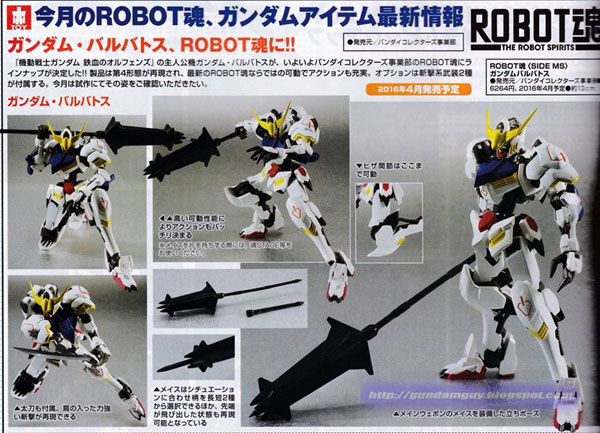 หุ่นรบกันดั้มตัวนี้ เป็นหุ่นประกอบสำเร็จรูป แบรนด์ Bandai ชื่อ  Robot Damashii ตัวหุ่นไม่ต้องต่อหรือประกอบขึ้นเหมือนกันพลา เป็นของเล่นคล้ายกับแอคชั่น ฟิกเกอร์ ซึ่งสามารถเปลี่ยนมือ อาวุธ และจัดท่าทางตามที่จุดขยับต่าง ๆ จะทำได้ เช่น หัว , ลำตัว , แขน , ขา , เท้า เป็นต้น เจ้าหุ่น Robot Damashii ตัวนี้ ก็เป็นหุ่นในไลน์ซีรี่ส์ กันดั้ม ภาคล่าสุด Mobile Suit Gundam: Iron-Blooded Orphans ที่กำลังเป็นกระแสอยู่ในเวลานี้ กำหนดวางจำหน่ายประมาณเดือน เมษายน 2016 ปีหน้า นั่นเอง…
