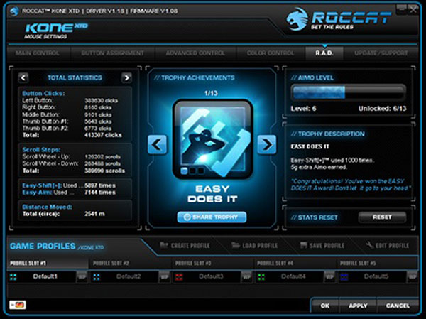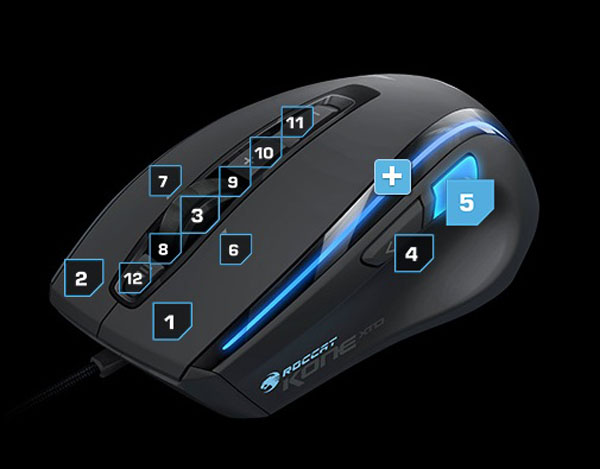 เจ้า Roccat Kone XTD ตัวนี้ มีปุ่มกดทั้งหมด 11 ปุ่มด้วยกัน โดยใช้ฟังก์ชั่น Easy-Shift กดปุ่มแบบผสมกันได้ แถมตัวลูกกลิ้งหรือว่าตัววิวเม้าส์สามารถโยกไปด้านข้างซ้าย-ขวาได้ สำหรับปุ่มคลิกเป็นสวิตช์แบบ Omron เสียงคลิกออกจะแหลม ๆ หน่อย คลิกง่ายแบบนุ่ม ๆ ไม่แข็ง ส่วน Software ทำออกมาได้หน้าตาน่าใช้มาก จัดว่าสวยงามกันเลย