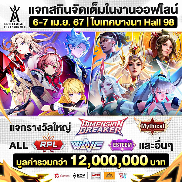 - วันที่ 6 เม.ย. 67 แจก Jersey RoV และโค้ดสกิน Limited ถาวร (เลือก 1 จาก 5 สกินดังนี้ Yena: Gymnast, Ignis: Flaming, Keera: Carano Scholar, Helen: Forest Tale, Slimz: Rumble Time)