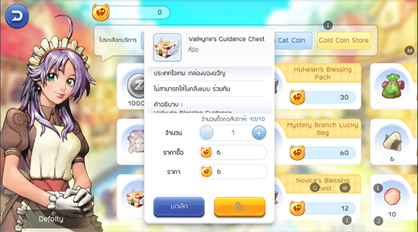 และนอกจากการทำเควส และบริจาคแล้ว เมื่อมาถึงจุดๆหนึ่งที่ต้องใช้เหรียญทองในการอัพขั้นรูน เหรียญนี้ สามารถหาซื้อได้จากการเติมเงินเท่านั้น ซึ่งกล่อง Valkyries จะสามารถเติมซื้อได้เในราคา 6 เหรียญทองแมว (30 เหรียญทองแมว มีราคาที่ 179บาท)