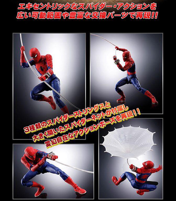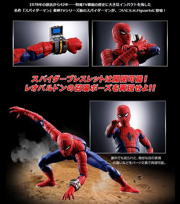 เวอร์ชั่นญี่ปุ่นของไอ้แมงมุม จะให้ความรู้สึกเหมือนคนใส่ชุดในหนังแปลงร่างญี่ปุ่น มากกว่าชุดหนังรัดแนบเนื้อแบบอเมริกา โดยตัวสไปเดอร์แมนจะมีตาที่แหลมเรียวเฉี่ยวโฉดกว่าไอ้แมงมุมตัวอื่นๆในจักรวาล โดยสินค้าจะมีอุปกรณ์เสริมซิกเนเจอร์อย่าง Spider Bracelet -กำไลแมงมุม ทีเป็นทั้งที่เก็บชุด อุปกรณ์สื่สาร เครื่องพ่นใย และคอมพิวเตอร์ในอย่างเดียวกัน เรียกว่าสร้างทีใช้ซะคุ้มเลย!
