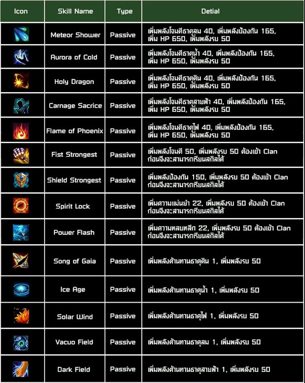 สกิลฝึกฝนแบบ Passive ที่ส่งผลต่อตัวละคร โดยคุณสามารถเลือกที่จะอัพสกิลไหนก็ได้ตามความเหมาะของตัวละครที่คุณเล่น สามารถอัพได้เมื่อตัวละครมีเลเวล 59 ขึ้นไป รายละเอียดของแต่ละสกิลมีดังต่อไปนี้