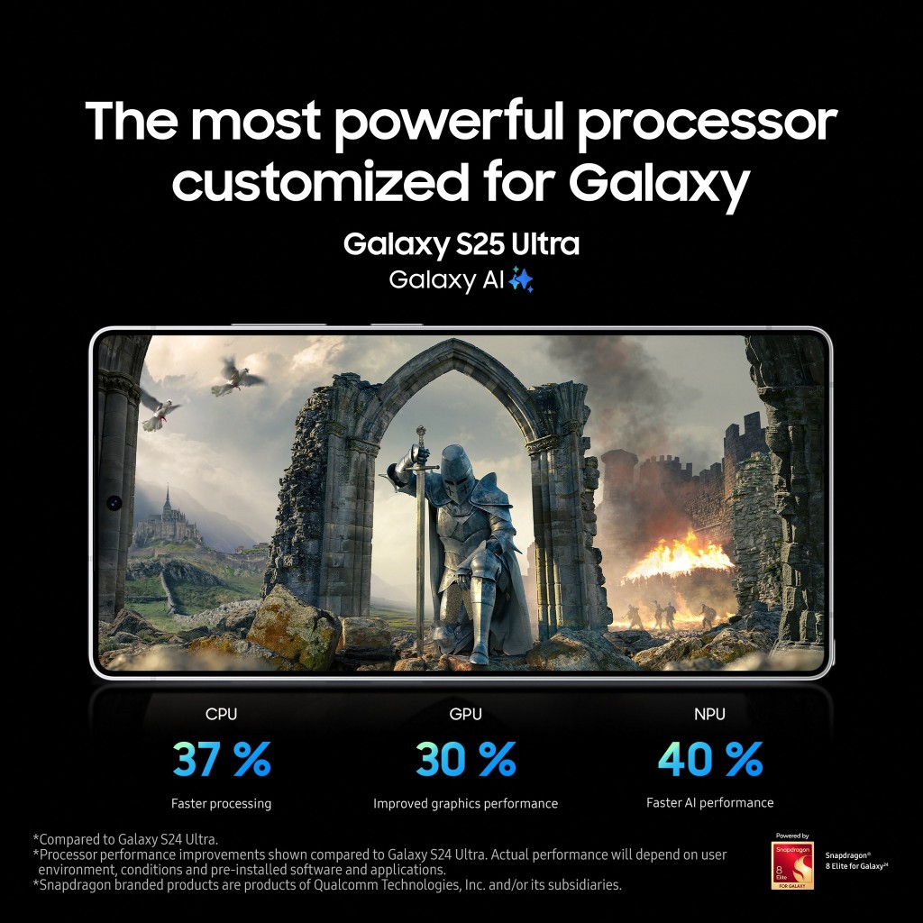 Galaxy S25 Series ขับเคลื่อนด้วยชิปเซ็ต Snapdragon® 8 Elite for Galaxy ที่ได้รับการปรับแต่งเฉพาะสำหรับ Galaxy ทำให้เป็นโปรเซสเซอร์ที่ทรงพลังที่สุดในประวัติศาสตร์ของตระกูล Galaxy S series ด้วยการเพิ่มประสิทธิภาพ NPU ถึง 40%, CPU 37%[9] และ GPU 30% เมื่อเทียบกับรุ่นก่อนหน้า โดยพลังประมวลผลนี้จะช่วยให้ Galaxy S25 Series สามารถรองรับประสบการณ์ด้าน AI บนอุปกรณ์ได้มากขึ้น โดยลดทอนประสิทธิภาพลง เช่น ฟีเจอร์ Generative Edit[10] ที่ก่อนหน้านี้เคยต้องใช้การประมวลผลบนคลาวด์