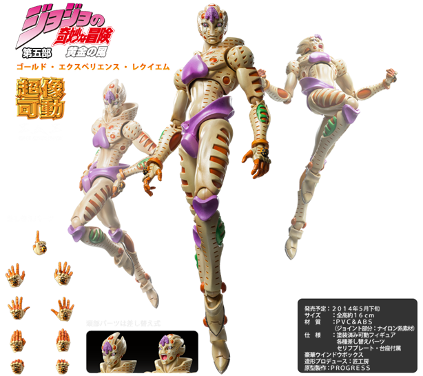 Gold Experience Requiem แสตนด์ร่างเพาเวอร์อัปจาก Gold Experience (Gold E) ของโจรูโน่ โจบาน่า พระเอกจากการ์ตูนเรื่อง โจโจ้ล่าข้ามศตวรรษ ภาค5 : Golden Wind เด็กหนุ่มลูกชายของ ดีโอ (บอสภาค 1 และภาค3) ที่มีความใฝ่ฝันอยากจะเป็นขาใหญ่ในวงการมาเฟีย (คิดไปได้) โดยเจ้าแสตนด์ Gold Experience Requiem ถ้าเทียบในการ์ตูนซีรี่ส์ โจโจ้ แล้วนั้นน่าจะเป็น แสตนด์ที่เก่งที่สุดแล้ว ด้วยความสามารถ สร้างห้วงเวลาซ้ำแล้วซ้ำเล่า ทำให้เป้าหมายต้องติดอยู่ในห้วงเวลานั้นไปตลอดกาล เนื่องจากไปไม่ถึงความจริง เท่ากับว่าไม่มีใครทำร้าย เค้าได้เลยแถมยังโดนขังในมิติที่ไม่มีที่สิ้นสุด ตายซ้ำไปซ้ำมาไม่รู้จบ ช่างน่ากลัวจริงๆครับ เทพขนาดนี้ใครจะกล้าต่อกร รับรองเจอดีแน่ๆ เราลองมาดูของเล่น Gold Experience Requiem กันเลยดีกว่าว่าจะสามารถถ่ายทอดที่แสดงถึงลายเส้นต้นฉบับได้ดีแค่ไหน ไปชมกันเลย