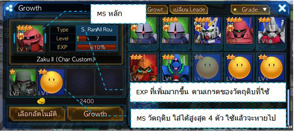 ระบบที่ช่วยเพิ่มเลเวลของ MS ที่ต้องการโดยใช้ MS ตัวอื่นมาเป็นวัตถุดิบ โดยไปที่ ตึก MS Development แล้วเลือก “Growth”