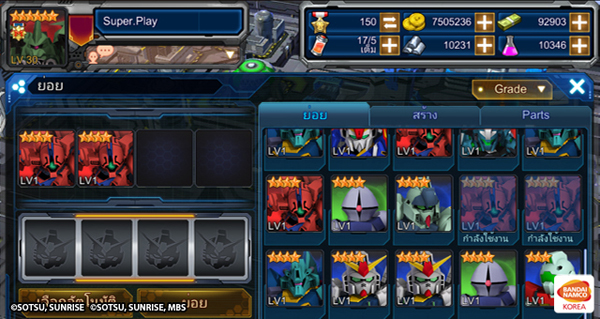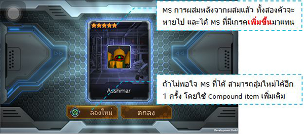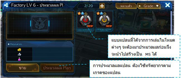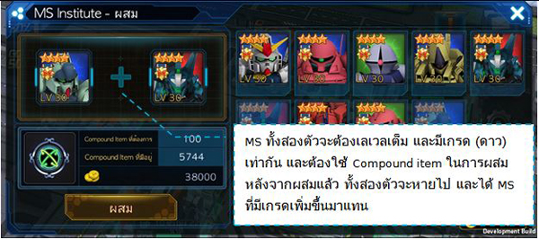 จากนั้นเลือก MS ที่เลเวลเต็มแล้ว 1 ตัว ระบบจะแสดง Parts และ ทรัพยากรที่ต้องการ หากมีครบ ก็สามารถอัพดาวของ MS ได้ทันที