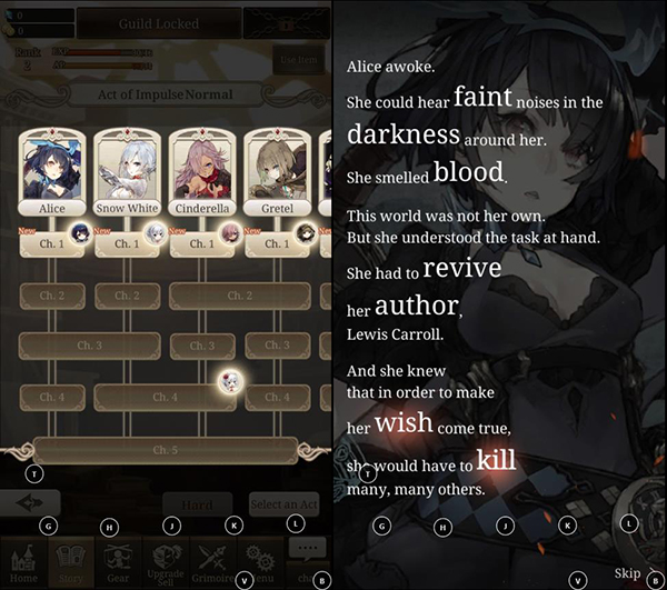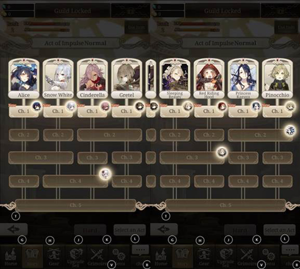 1.Story Mode – โหมดเนื้อเรื่องหลัก เกม SINoALICE จะเปิดโอกาสให้คุณเลือกผจญภัยไปกับเรื่องราวของ 8 ตัวละครหลักได้ตามใจอยาก อย่างที่เห็นจากแผนภาพด้านบนว่าจะมี Chapter ที่มีตัวละครได้มามีบทบาทร่วมกันด้วย ใน 1 Chapter นั้นจะประกอบไปด้วยบทย่อยประมาณ 10 ตอน (Chapter 1-1 ถึง Chapter 1-10)