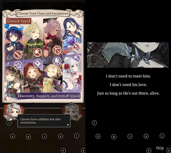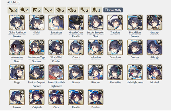 เหล่าตัวละครจะถูกแบ่งออกเป็น Class (Job) ที่จะมีจุดเด่นหรือหน้าที่หลักๆต่างกันไป แบ่งได้เป็น 2 ประเภทใหญ่สุดก็คือ Attack Type และ Support Type ซึ่งภายในทั้ง 2 ไทป์นี้ก็จะมีคลาสย่อยอยู่อีกตามภาพด้านบน ไล่จากซ้ายไปขวา Breaker, Crusher, Gunner, Paladin, Minstrel, Sorcerer, Mage และ Cleric