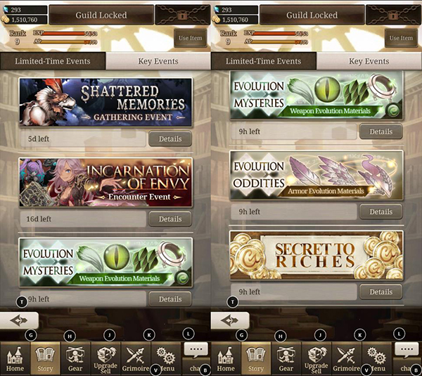 ส่วน Event ก็จะแบ่งออกเป็นอีเวนท์จำกัดเวลา ที่พร้อมจะมอบไอเท็มเลอค่าให้กับเหล่าผู้เข้าร่วม และอีเวนท์ประจำวัน ซึ่งเป็นด่านสำหรับฟาร์มไอเท็ม ของอัพ และเงินตามประสาเกม RPG ทั่วไป