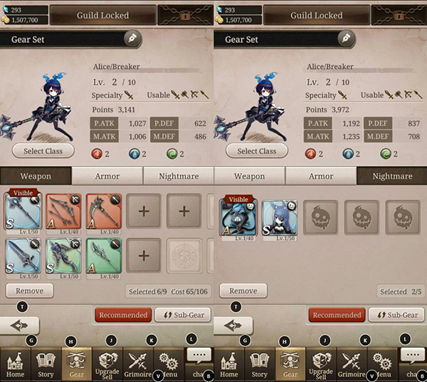 6.Gear – เลือกอุปกรณ์สวมใส่หรือการ์ดสกิลนั่นเอง ใส่กับตัวละครของคุณไว้ใช้งาน นอกจากนี้ก็ยังมีการเลือกใช้ Nightmare ซึ่งจะช่วยบัฟ หรือดีบัฟระหว่างการเล่นได้ด้วย