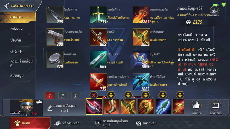การออกของก็ตามภาพเลยครับ จะพยายามเน้นไปที่ “ค่าความเร็วในการโจมตี” เป็นหลัก เพราะเราต้องการค่านี้ไปเสริมดาเมจโจมตีเวท (สีม่วง) ทำให้สตาร์ลอร์ด สามารถยิงท่า 1 ได้เร็วแรง และถ้าออกพวกเจาะเกราะช่วงท้ายเกม ก็สามารถส่งแท้งก์เลือดเยอะอย่างฮัลคืกลับบ้านเก่าได้ไม่ยากอีกด้วย