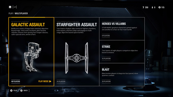 Galactic Assault -โหมดการเล่นยอดนิยม EXP พุ่งเร็ว สงครามสเกลใหญ่ ฝั่งละ20คน เหมือนเอาทุกโหมดมารวมกันในโหมดนี้ โดยทุกๆการกระทำ จะมีแต้มสะสม ทั้งการยิงช่วยเพื่อน การฆ่า การทำภารกิจที่กำหนด หรือแม้แต่การตาย ก็จะได้รับแต้มไว้ปลดล๊อกตัวละครในเกมนั้นๆ