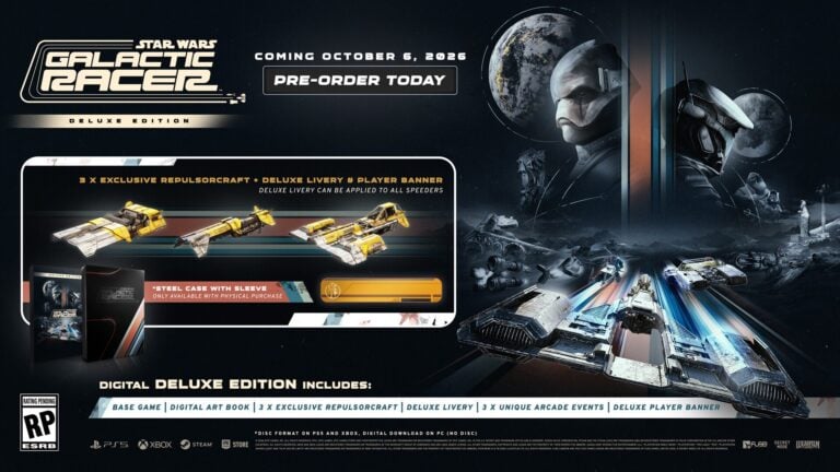 Star Wars: Galactic Racer เตรียมวางจำหน่ายบน PlayStation 5, Xbox Series และ PC ผ่านทาง Steam และ Epic Games Store ในวันที่ 8 ตุลาคม 2026 โดยจะวางจำหน่ายในรูปแบบต่างๆ ดังนี้: