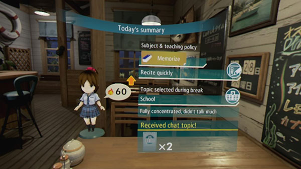 ผู้เล่นสามารถเลือกคำสั่งว่าจะทำอะไรในระหว่างที่เธอกำลังตั้งใจเรียนได้