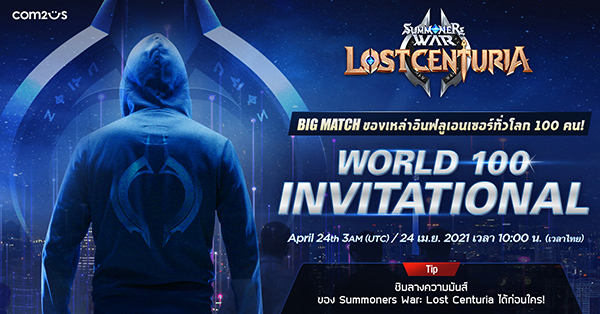 สามารถรับชมไลฟ์สตรีมมิ่งได้ที่เว็บไซต์ออฟฟิชเชียล ‘World 100 Invitational’ และแชนแนล YouTube หลักของ Com2uS และสามารถดูรายละเอียดเพิ่มเติมเกี่ยวกับเกมและการลงทะเบียนล่วงหน้าของ Summoners War: Lost Centuria ได้ที่เว็บไซต์หลัก : https://lostcenturia.summonerswar.com/world100invitational