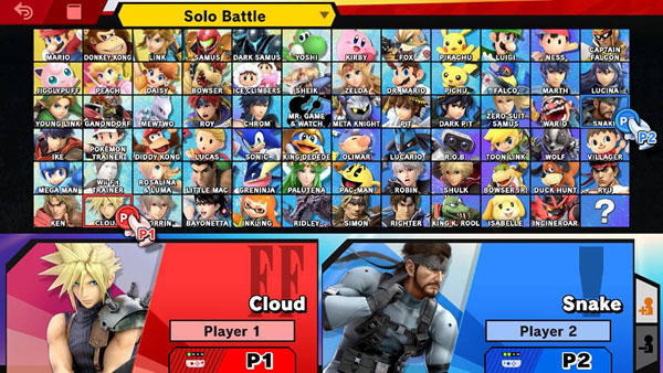 ตัวเกมส์รวบรวมตัวละครหลักที่ให้เราสามารถบังคับได้ ไว้กว่า 71 ตัว และยังมีตัวละครไอเทมช่วยสู้ในฉาก และตัวละครการ์ดผู้ช่วยอีกมากมาย นับตั้งแต่ตัวละครจากค่าย Nintendo จากซีรี่ มาริโอ้ / เซลด้า / โปเกมอน / ไฟเอมเบลม แล้วยังมีตัวละครดังจากค่ายอื่นมาร่วมแจมในเกมนี้อีกมากมาย เช่น ลุงเสนคจาก Metal Gear Solid และ แส้ปราบมาร ซิมม่อน จาก Castelvania / Sonic จากค่าย SEGA / ริว เคน จาก Streetfighter และ ร๊อคแมน จาก Capcom / สาวสวยสุดเซ็กซี่ บายอเนทต้า ก็มา และทีเด็ดก็คือ คลาวด์ จาก Final Fantasy ก็มาร่วมศึกในเกมนี้ด้วยเช่นกัน