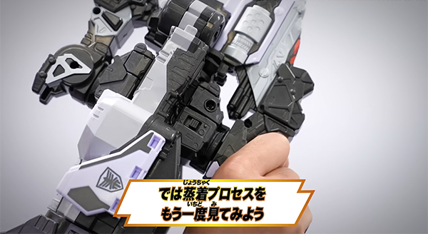 เรามาย้อนดูการ “สวมเกราะ” กันอีกครั้ง! เมื่อได้รับคำสั่งโชฉะกุ…  “EMORGY” ที่พุ่งสูงขึ้นจนทะลุขีดจำกัด EMORGY จะเข้าไปหลอมรวมกับ “อนุภาคกัลวาเรียน” ที่ถูกอัดแน่นอยู่ภายในไกปืน แล้วถูกฉายภาพออกมาเป็น “คอมแบทสูท” โดยใช้เวลาเพียง 0.001 วินาที! และถือว่า…กระบวนการสวมเกราะจึงเสร็จสมบูรณ์!