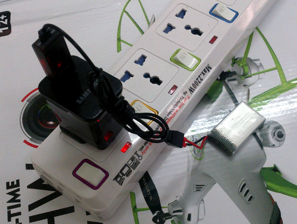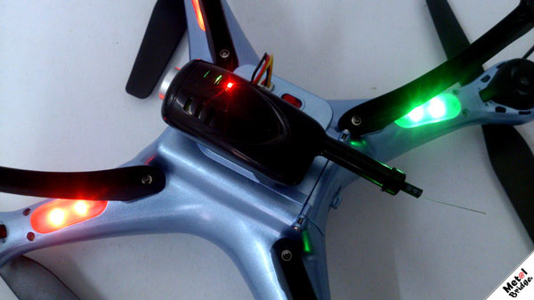 เสียบกล้องยึดติดไว้ใต้เครื่องแล้วเสียบสายไฟกล้องเข้ากับตัวเครื่อง ใช้ไฟเลี้ยงจากแบตโดรน