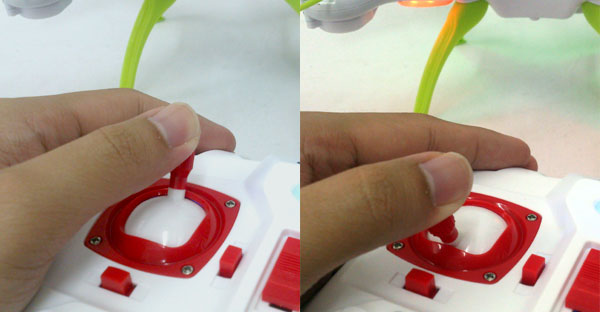 4. ที่ตัวโดรนไฟหยุดกระพริบเป็นอันใช้ได้ ทดลองดันแกนซ้ายขึ้นสุดค้างไว้ 3 วินาที ให้ใบพัดหมุนจากนั้นดันตัวขึ้น ตามความสูงที่ต้องการ