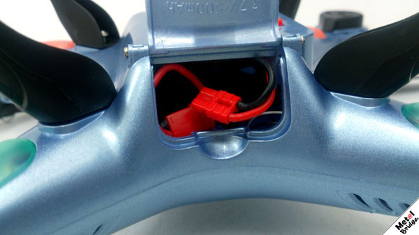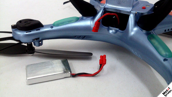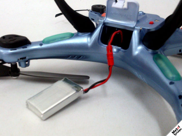 เปิดฝาด้านท้ายของตัวโดรนจะมีก้อนแบตเตอรี่อยู่ข้างใน เชื่อมต่อด้วยสายไฟแดงดำ