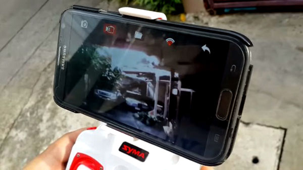 กล้องที่มากับโดรนรุ่น Syma X5 HW จะเป็นรุ่นที่ทำงานกับแอพโทรศัพท์มือถือ เป็นการส่งภาพจากกล้องด้วยสัญญาณ Wifi ไปแสดงผลที่หน้าจอมือถือ แบบ Real Time แล้วสามารถเลือกกดถ่ายรูปหรือบันทึกวีดีโอเก็บเป็นไฟล์ไว้ที่โทรศัพท์ได้ด้วย