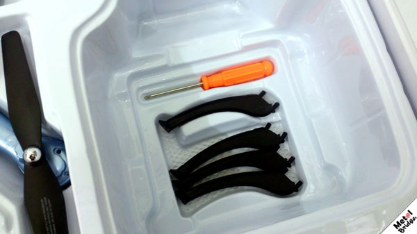 ขาตั้งโดรนเพื่อป้องกันตัวเครื่องและกล้องกระแทกกับพื้น เสียบที่ใต้เครื่องขับน๊อตให้แน่น จะอยู่ที่ด้านในกล่อง มาพร้อมไขควงสำหรับไขน๊อต
