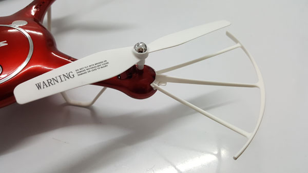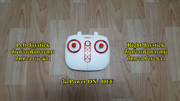 4. ที่ตัวโดรนไฟหยุดกระพริบเป็นอันใช้ได้ ทดลองดันแกนซ้ายขึ้นสุดค้างไว้ 3 วินาที ให้ใบพัดหมุนจากนั้นดันตัวขึ้น ตามความสูงที่ต้องการ