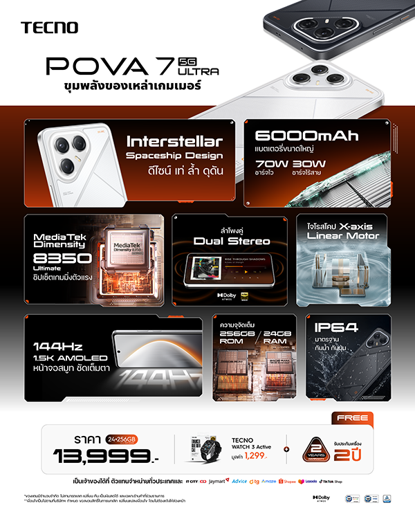 โดยรุ่นเรือธงของซีรีส์อย่าง POVA 7 Ultra 5G ได้รับแรงบันดาลใจจากความล้ำสมัยของห้วงอวกาศ Interstellar Design มาพร้อมขุมพลังระดับแฟลกชิปด้วยแบตเตอรี่ความจุ 6,000mAh รองรับระบบชาร์จเร็ว 70W Ultra Charge และชาร์จไร้สายความเร็วสูง 30W Wireless Fast Charge ขับเคลื่อนด้วย หน่วยประมวลผล MediaTek Dimensity 8350 Ultimate AI เพื่อมอบประสิทธิภาพการเล่นเกมระดับสูงสุด และการใช้งานแบบ Multitasking ได้อย่างลื่นไหล มีประสิทธิภาพ