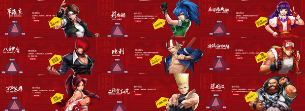 ตัวละครในเกมนี้ก็ยังเป็นตัวละครหน้าเดิมๆจากเกมต้นฉบับ แต่นำมาวาดภาพประกอบใหม่ให้สวยงามขึ้น โดยตอนนี้จะมีแค่ เคียว / อิโอริ / เทอร์รี่ / บิลลี่ / เลโอน่า / เบนิมารุ / อาเธน่า / ไม และ ชาน โคฮัน เท่านั้น ในช่วงการเปิด Open Beta ครับ