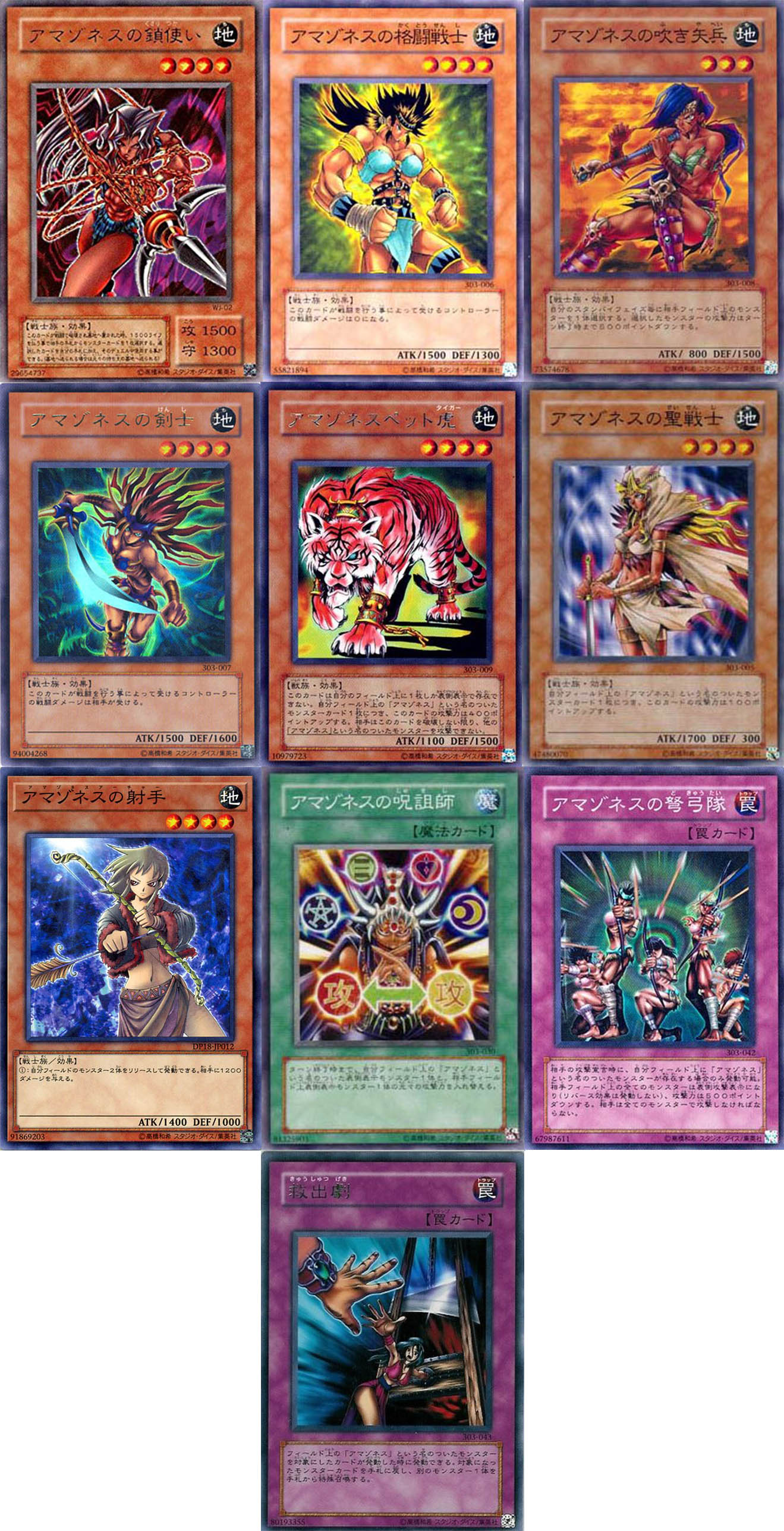 โดยเด็คอมาซอนเนสนั้นเป็นธีมการ์ดสายนักรบที่ไมนำมาใช้เล่นในช่วงของ ภาคBattle City ผสมกับเหล่าฮาร์ปี้เลดี้ของเธอ ซึ่งนอกเหนือจากเอกลักษณ์ของการ์ดที่ มักจะเป็นอาชีพต่างๆในชนเผ่าเหล่าอมาซอนเนสแล้ว เอฟเฟคของการ์ดที่สะท้อนความเสียหายจากการต่อสู้ให้อีกฝ่ายรับแทน ซึ่งแม้แต่ในปัจจุบันก็ยังมีค่อนข้างน้อย จึงทำให้นับว่าเป็นความโดดเด่นอีกอย่างหนึ่งของอมาซอนเนสในสมัยเลยทีเดียว