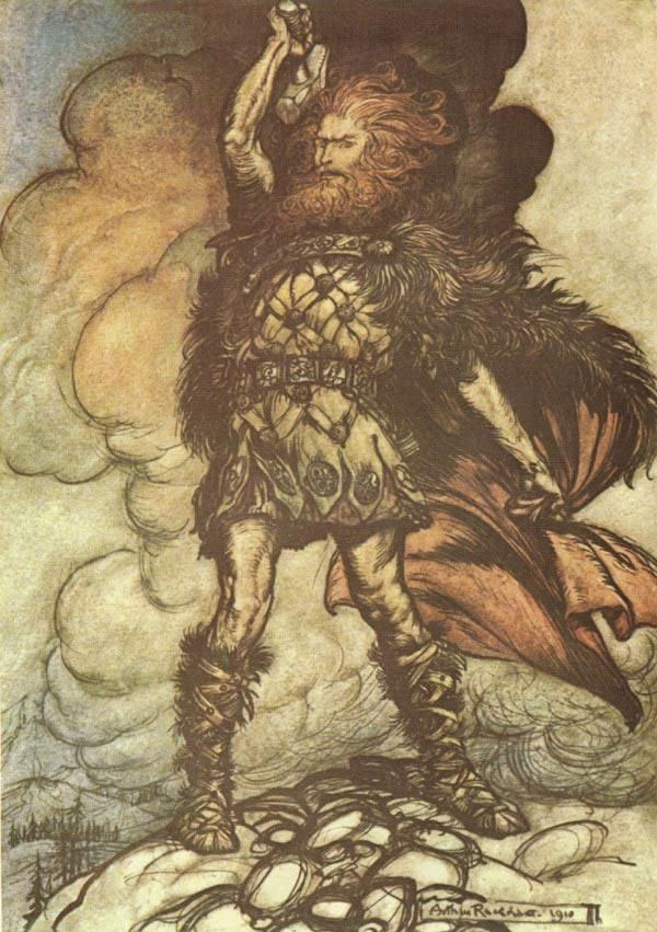 ตามตำนานได้กล่าวถึงบทบาทของธอร์เอาไว้ว่า… ธอร์เกลียดพวดยักษ์แบบเข้าไส้ (ไม่รู้ว่าเกลียดด้วยเรื่องอันใด?)  เมื่อตอนสมัยที่ยังเป็นเด็ก  เขามีพละกำลังมากจึงต้องในไปฝากยักษ์ทั้งสองที่ชื่อ Vingnir และ Hlora เลี้ยง ก่อนจะฆ่ายักษ์ 2 ตนนั้นตาย