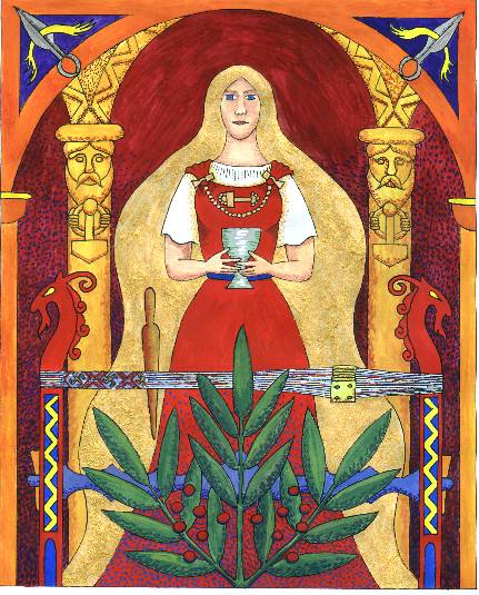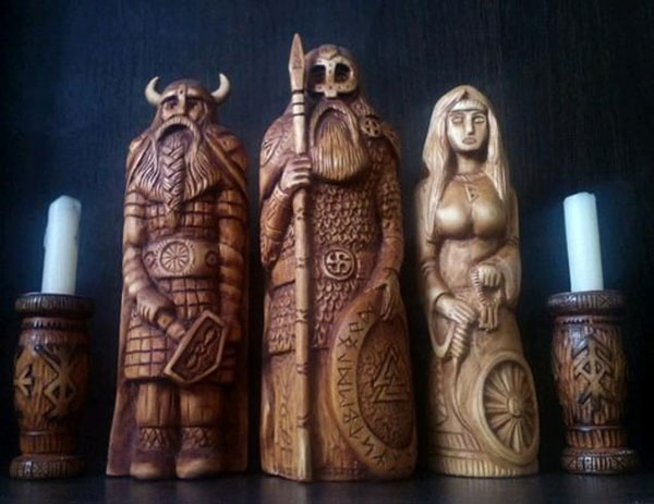 รูปสลักของธอร์ (ซ้ายสุด), โอดิน (กลาง) และ เฟร์ย่า (ขวาสุด)