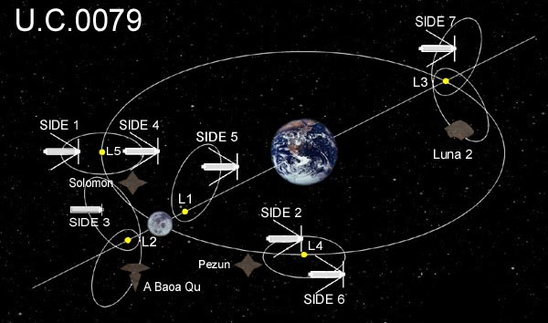 - กองกำลังอวกาศแห่งสหพันธ์โลก (Earth Federal Space Force EFSF) ถูกก่อตั้ง และทำภารกิจแยกออกจากกองทัพสหพันธ์โลก เพื่อเข้าแทรกแซงทางการเมืองของโคโลนี่ไซท์ 3