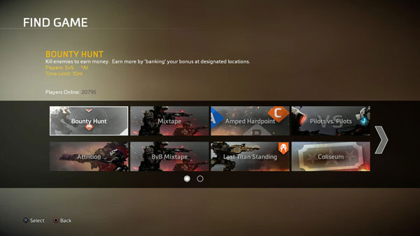 - Last Titan Standing : โหมด 5VS5 โหมดนี้พิเษศหน่อยคือเริ่มมาก็อยู่บนหุ่นTiatanเลย ชนะครบ4รอบก่อนก็ชนะไปเลย