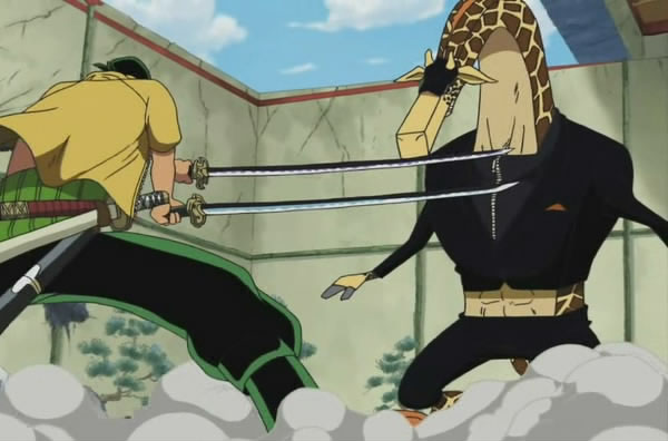 ผลปีศาจ อุชิ อุชิ เปลี่ยนร่างคาคุให้กลายเป็นยีราฟจมูกเหลี่ยมและยังทำให้ร่างกายใหญ่โตขึ้น คอยืดยาวทำให้วิสัยทัศน์กว้างไกลขึ้นด้วย ด้วยคอที่ยืดยาวยังนำมาใช้ในการตอสู้ได้เป็นอย่างดี ยิ่งเจ้าของมีทักษะที่ร้ายการสามารถเพิ่มพลังทำลายโดยใช้ร่างกายอันใหญ่โตผ่าครึ่งหอคอยแห่ง ความยุติธรรมเป็นสองซีก แบบเดียวกับที่ลุชชี่ในร่างเสือดาวทำกับสำนักงานใหญ่กัลเลย์ลาคอมปานี