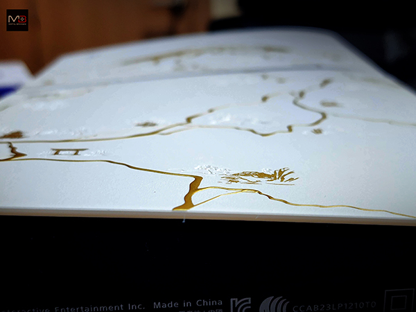 ตัวเครื่องคอนโซล PlayStation 5 Ghost of Yōtei Gold Limited Edition มาพร้อมกับลวดลายสีทองที่พาดผ่านตัวเครื่องด้านบน โดยมีภาพภูเขาไฟโยเท (Mount Yōtei) เป็นจุดศูนย์กลาง พร้อมตราสัญลักษณ์ PlayStation ที่สลักลงบนชิ้นงานอย่างประณีต ทำให้แต่ละเครื่องมีเอกลักษณ์เฉพาะตัว