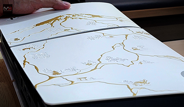 โดยไฮไลต์สำคัญคือลวดลาย ‘คินสึงิ’ (kintsugi) ที่เป็นศิลปะการซ่อมแซมภาชนะแตกหักด้วยการเชื่อมต่อด้วย “ทอง”  ซึ่งสื่อถึงความงามของความไม่สมบูรณ์ได้อย่างลึกซึ้ง