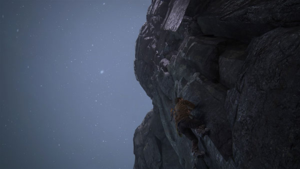ปีนหน้าฝาสูงชันอันหนาวเหน็บ มองเห็นหิมะตกปลิวรอบบริเวณ